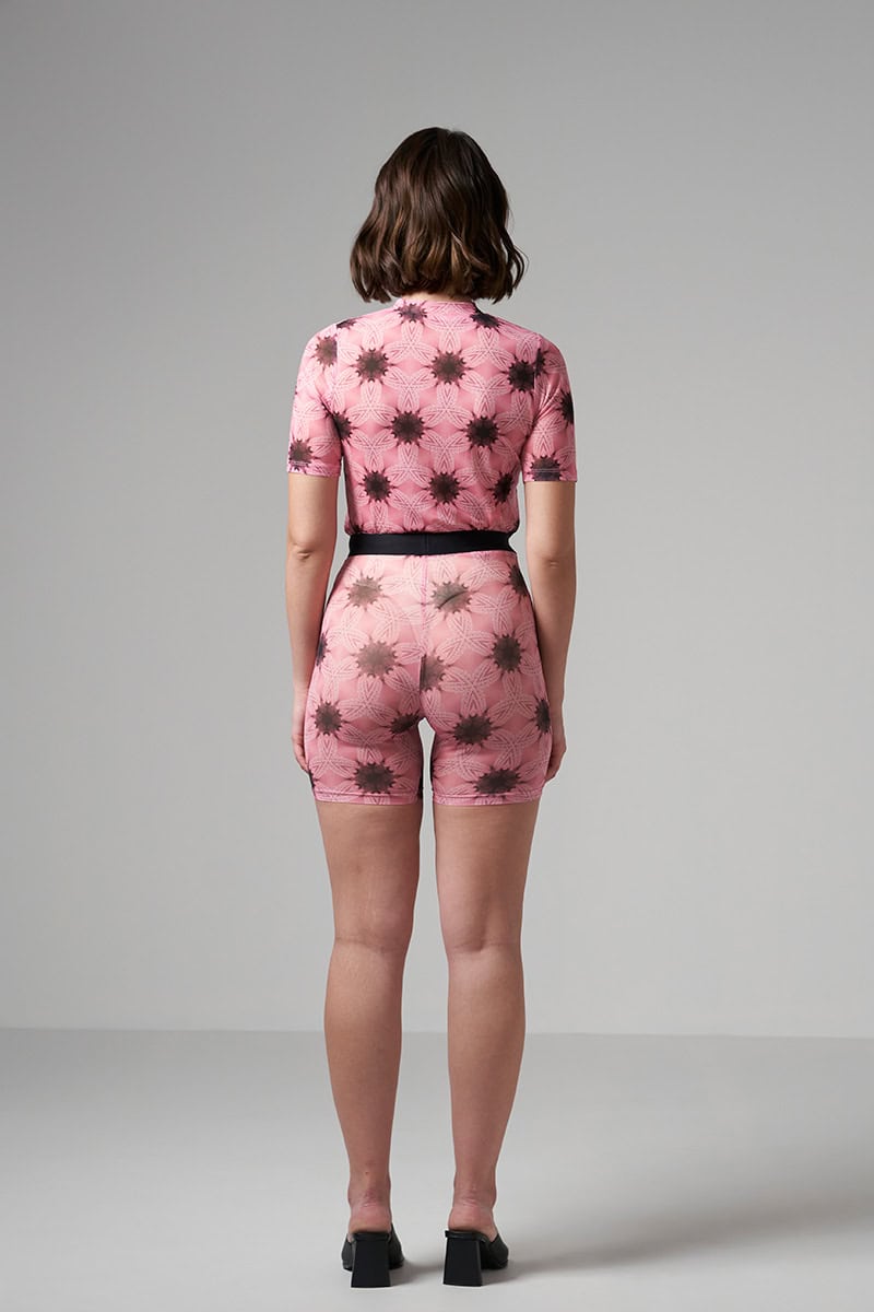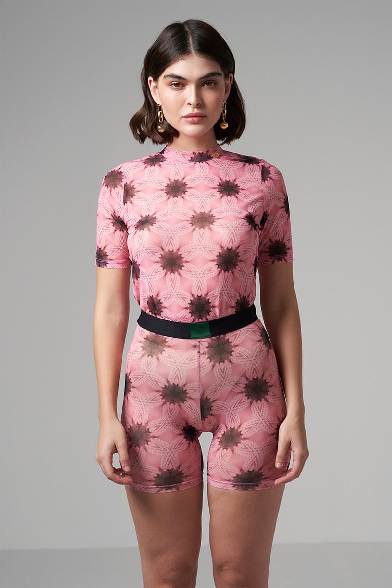 2 pieces set Stretch fit fabric Semi-sheer High neck top Small golden button decorations on the neckline Short sleeves Printed tulle High- waist short legging Super skinny cut Elastic waistband with satin logo