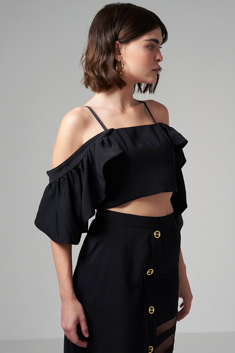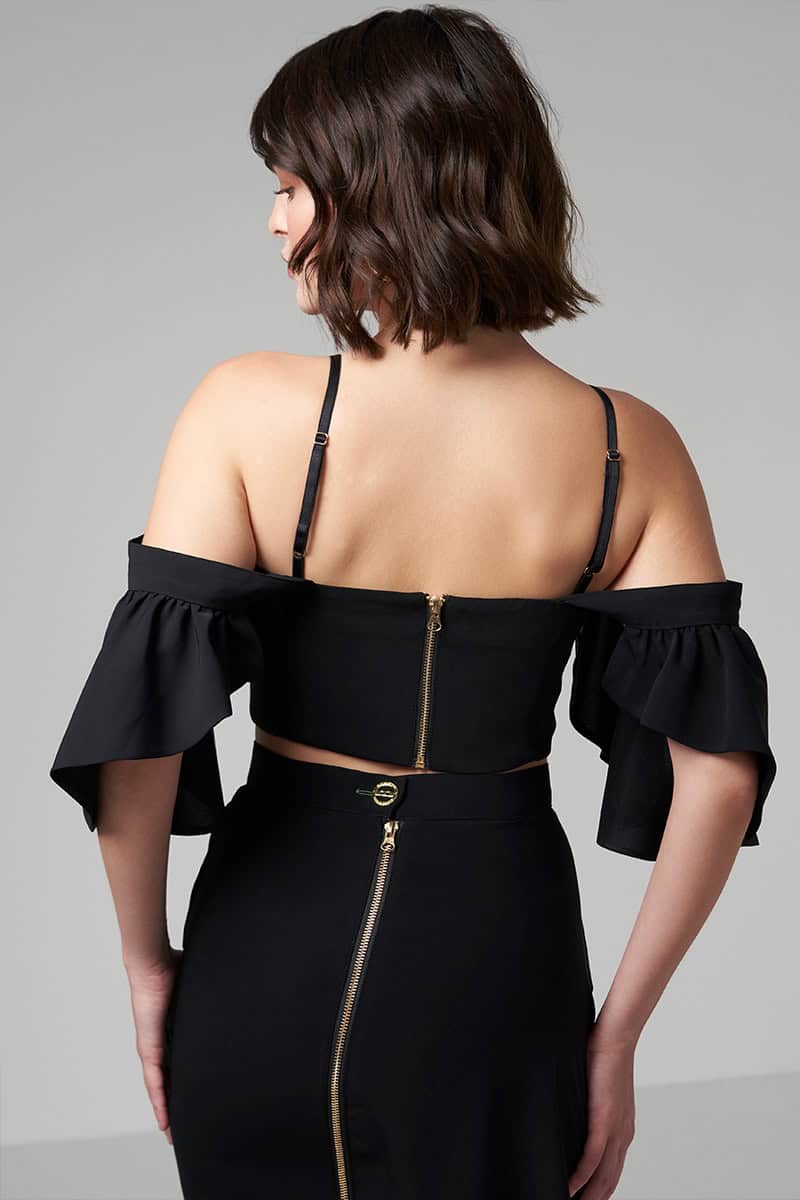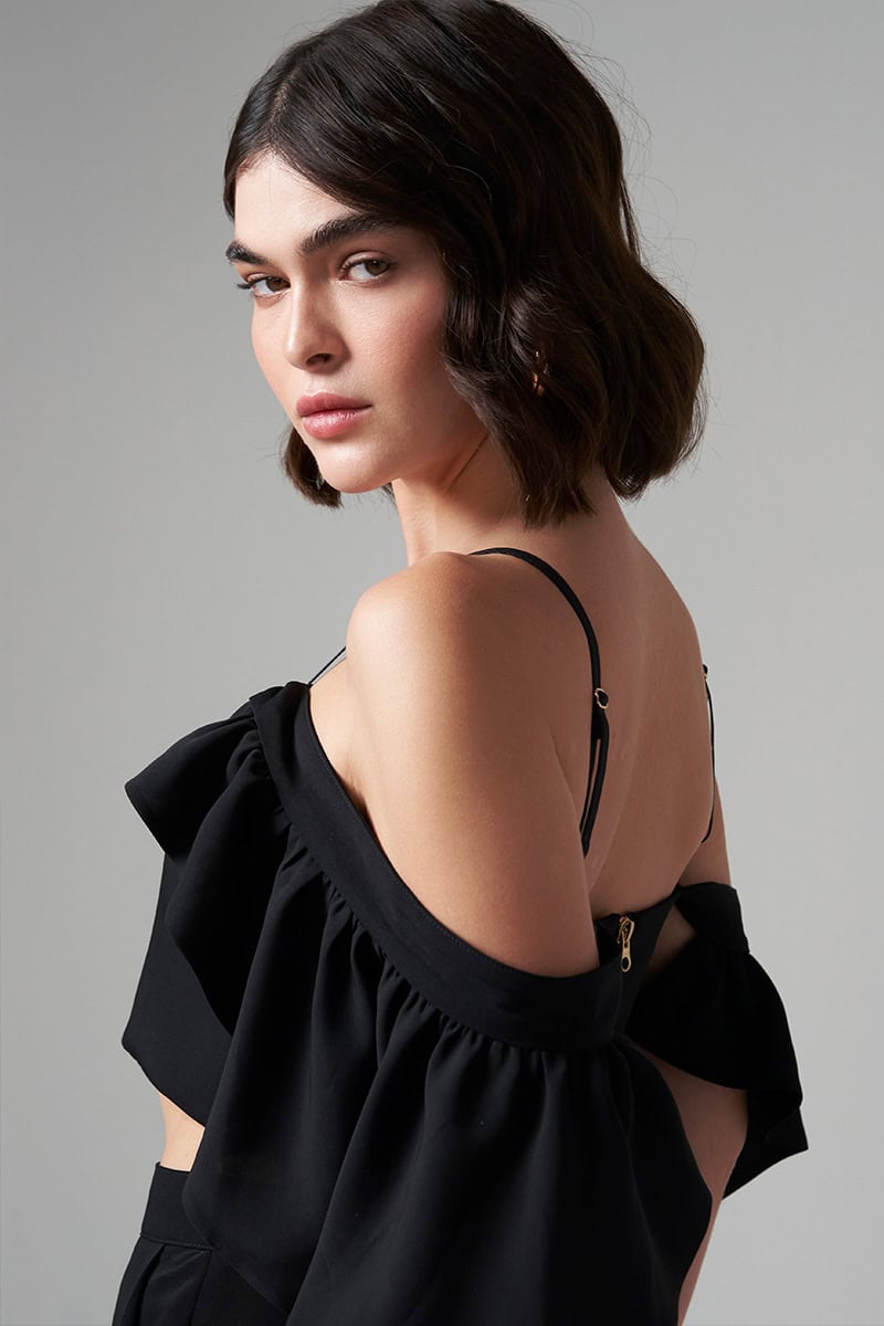 דגם בשחור בגודל 169 ס”מ ולובש מידה s