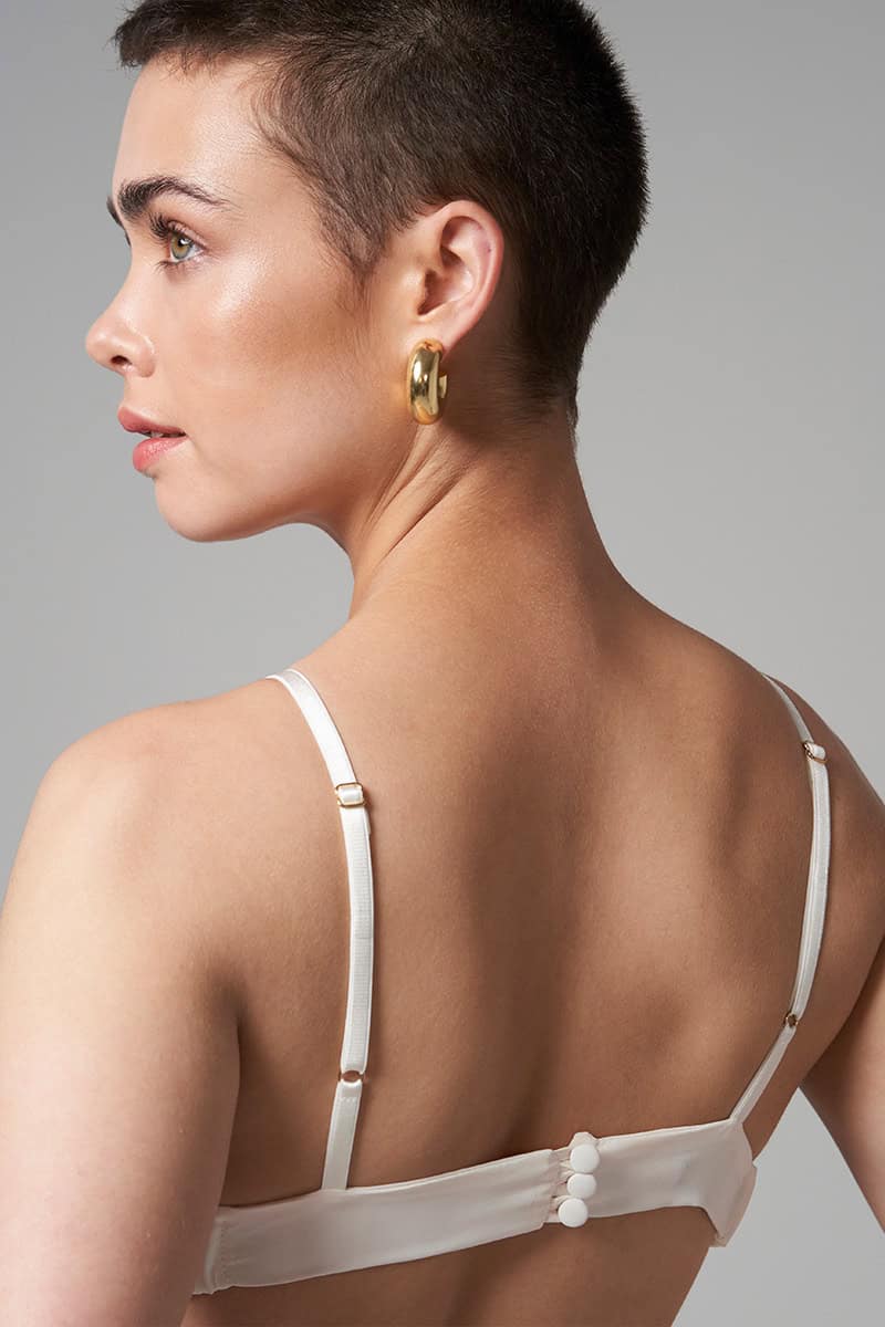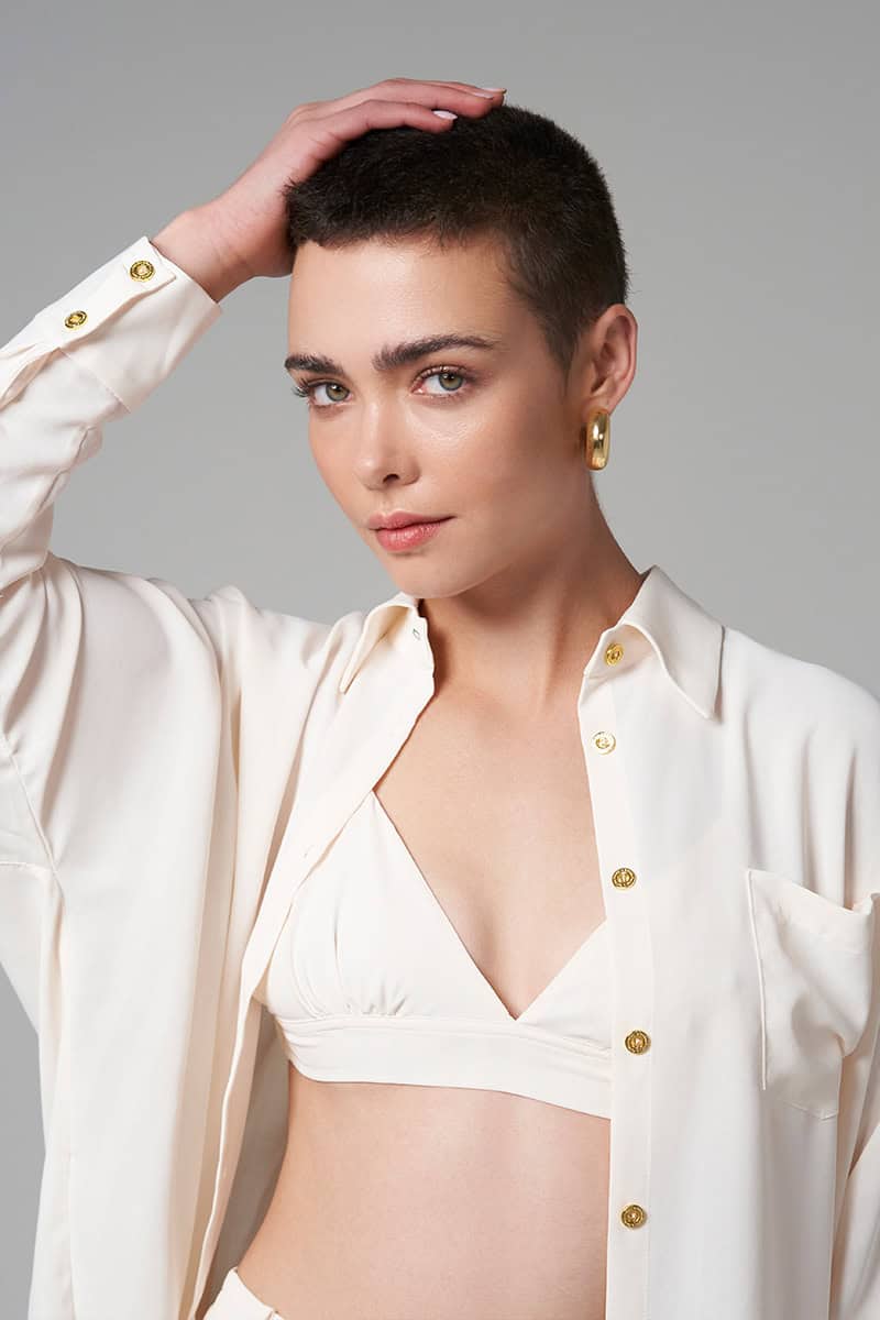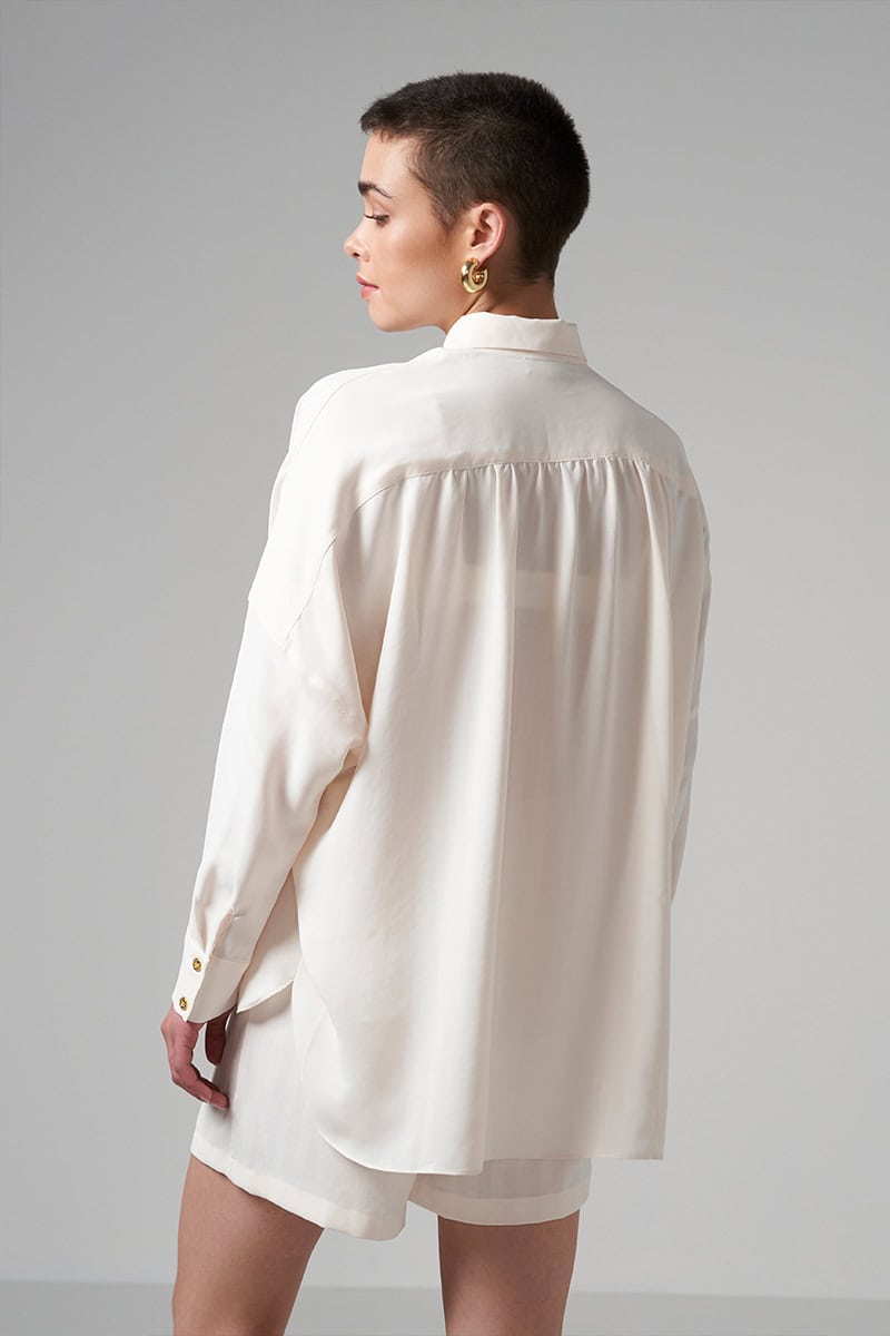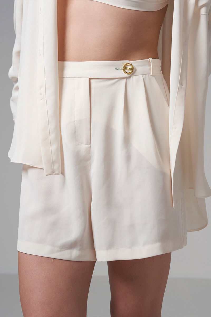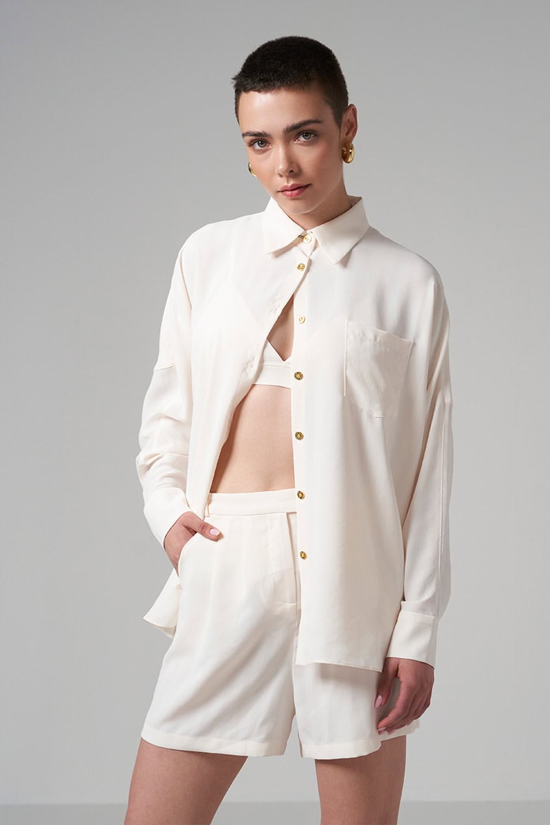 3 pieces set. Button shirt: Relaxed fit. Gathering at the back. Buttons in gold metal on the front. Tailored cuffs with 2 golden metal buttons Shorts: Relaxed fit. Zip and gold metal button closure on the front. Belt loops. Elastic at the back waist line. 2 slanted pockets Triangle top: Gathering on the front. Elastic adjustable straps Buttons closure at the back